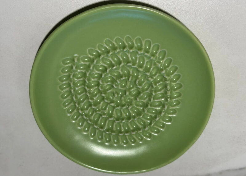 - Round plate with gradual raised perimeter featuring center spiral pattern raised “teeth” for grating garlic (or other root vegetables, hard cheeses, chocolate and more!) and recessed to mix with olive oil