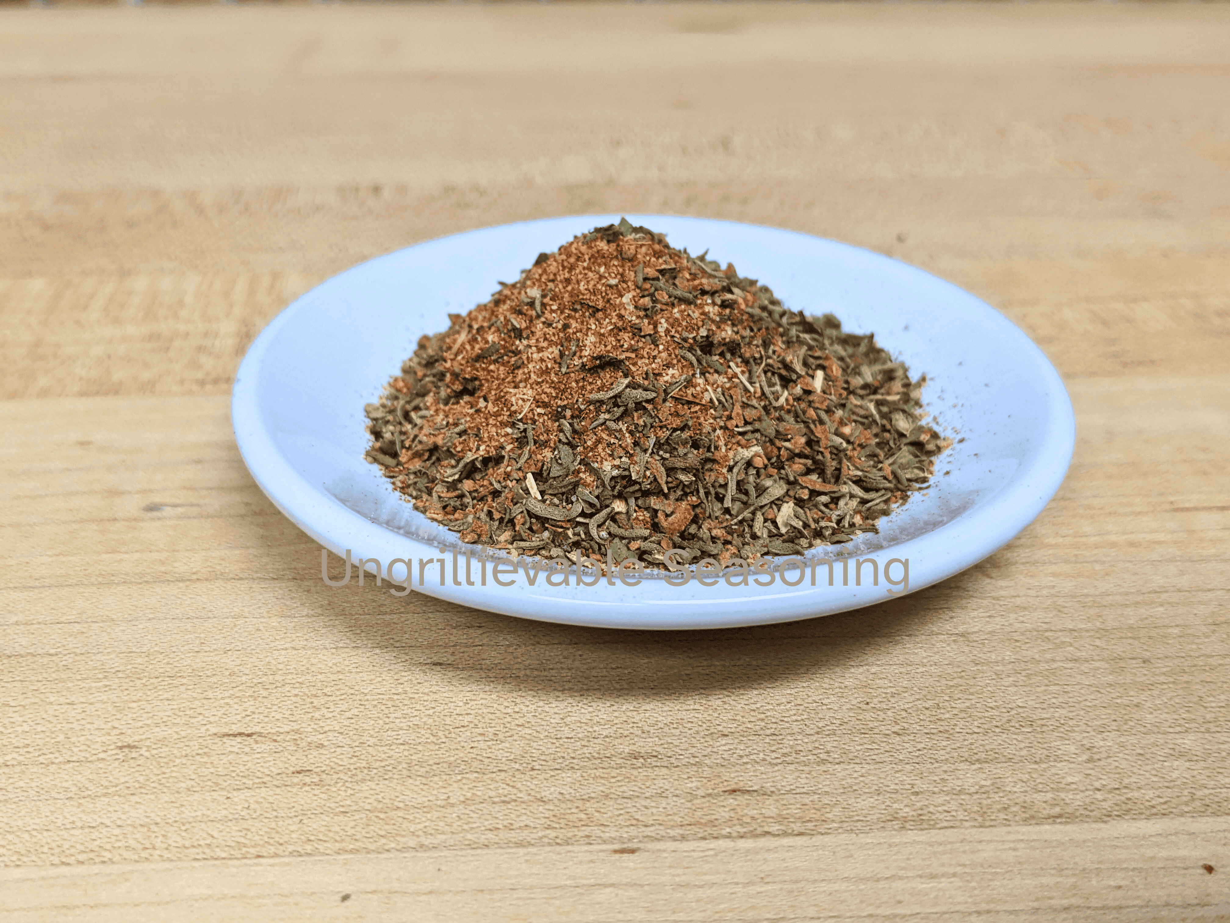 Ingredients: Mexican oregano, thyme, paprika, coarse black pepper, white pepper, garlic powder, onion powder, de arbol chili powder and salt.